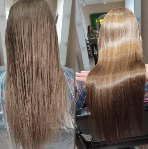 После завершения процедуры волосы становятся идеально ровными, но при этом сохраняют естественный объём и лёгкость.
